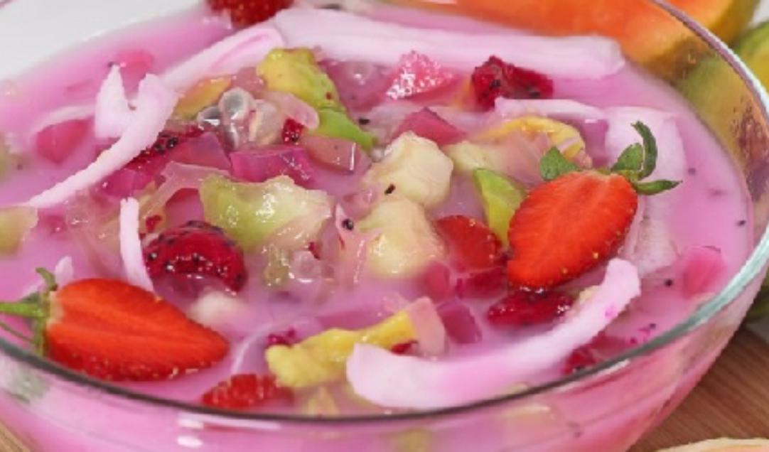Gaul bersama mangga yang telah dicincang halus. Mix fruits buah campur laici susu cair mangkuk agar-agar merah sirap rose potong dadu mangkuk agar-agar biru potong dadu mangkuk agar-agar hijau potong dadu mangkuk besar ais kiub Agar-agar buat sendiri. Salad Lobak Merah Pedas.